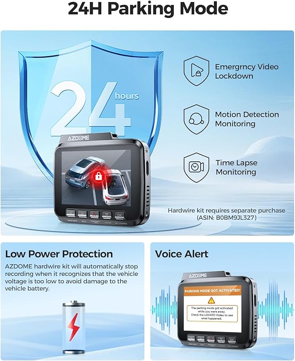 - 24H Parking Monitoring: AZDOME Car dashboard camera connect the dash cam to the hardwire kit (Sold Separately, ASIN: B0BM9JL327) to activate the time-lapse function, which ensures the integrity of the recorded content, saves storage space and helps the dash cam achieve 24-hour monitoring function.