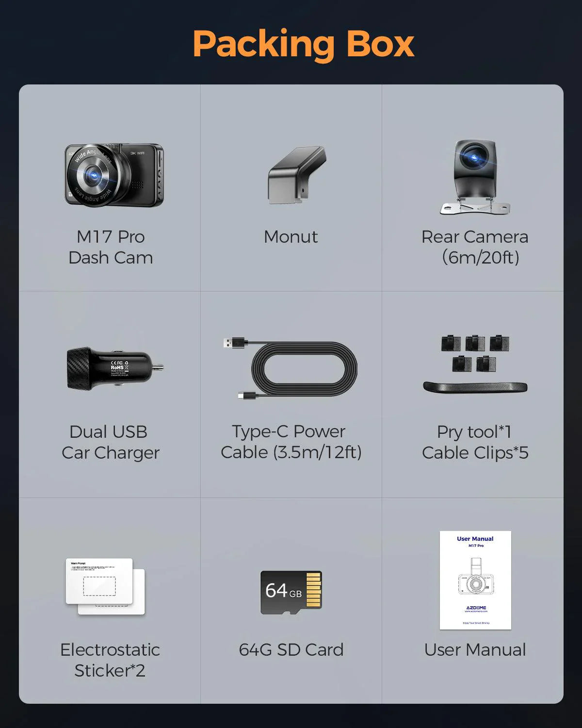 The M17 Pro is designed to minimize blind spots with its wide-angle lenses. The front camera offers a 150° field of view, while the rear camera provides a 130° view, ensuring comprehensive coverage of the road and your surroundings.